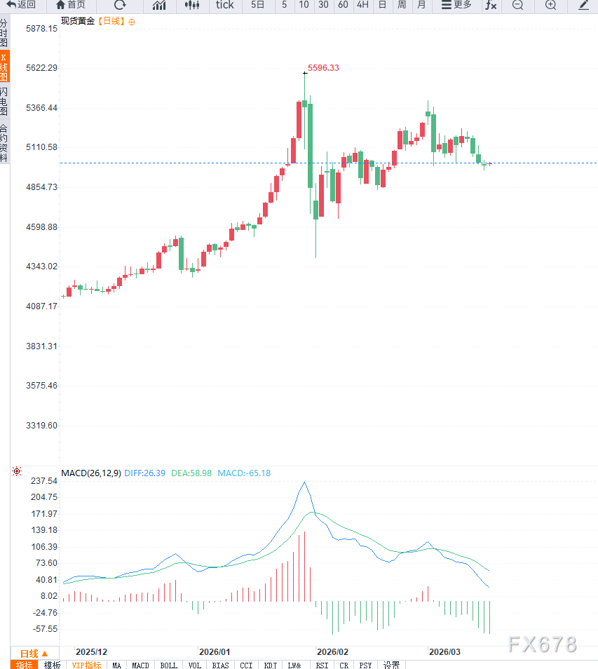 技术面来看,日线级别上,黄金此前维持强劲上升趋势,但在接近5000美元整数关口后出现明显滞涨迹象。价格多次冲高未能有效突破,显示上方抛压增强。目前下方关键支撑位关注4850-4800美元区间,若跌破该区域,则可能引发更深层调整;但整体结构仍保持高位震荡格局,趋势尚未完全转空。